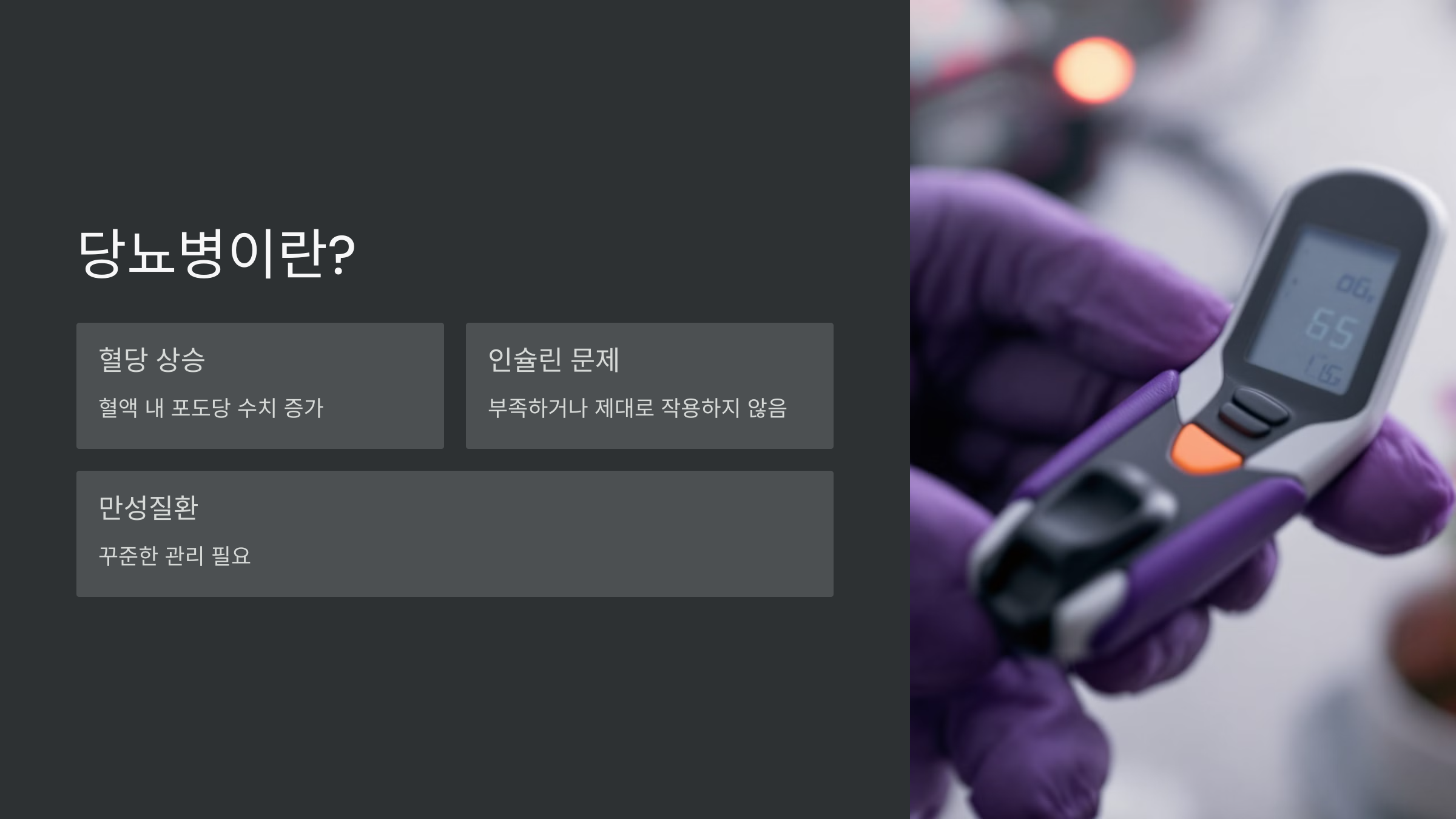 당뇨병은 혈당(혈액 내 포도당)이 정상보다 높아지는 질환이에요. 혈당을 조절하는 인슐린이 부족하거나 제대로 작용하지 않으면 우리 몸의 에너지원이 되는 포도당이 제대로 활용되지 못하고 혈액 속에 쌓이게 됩니다.