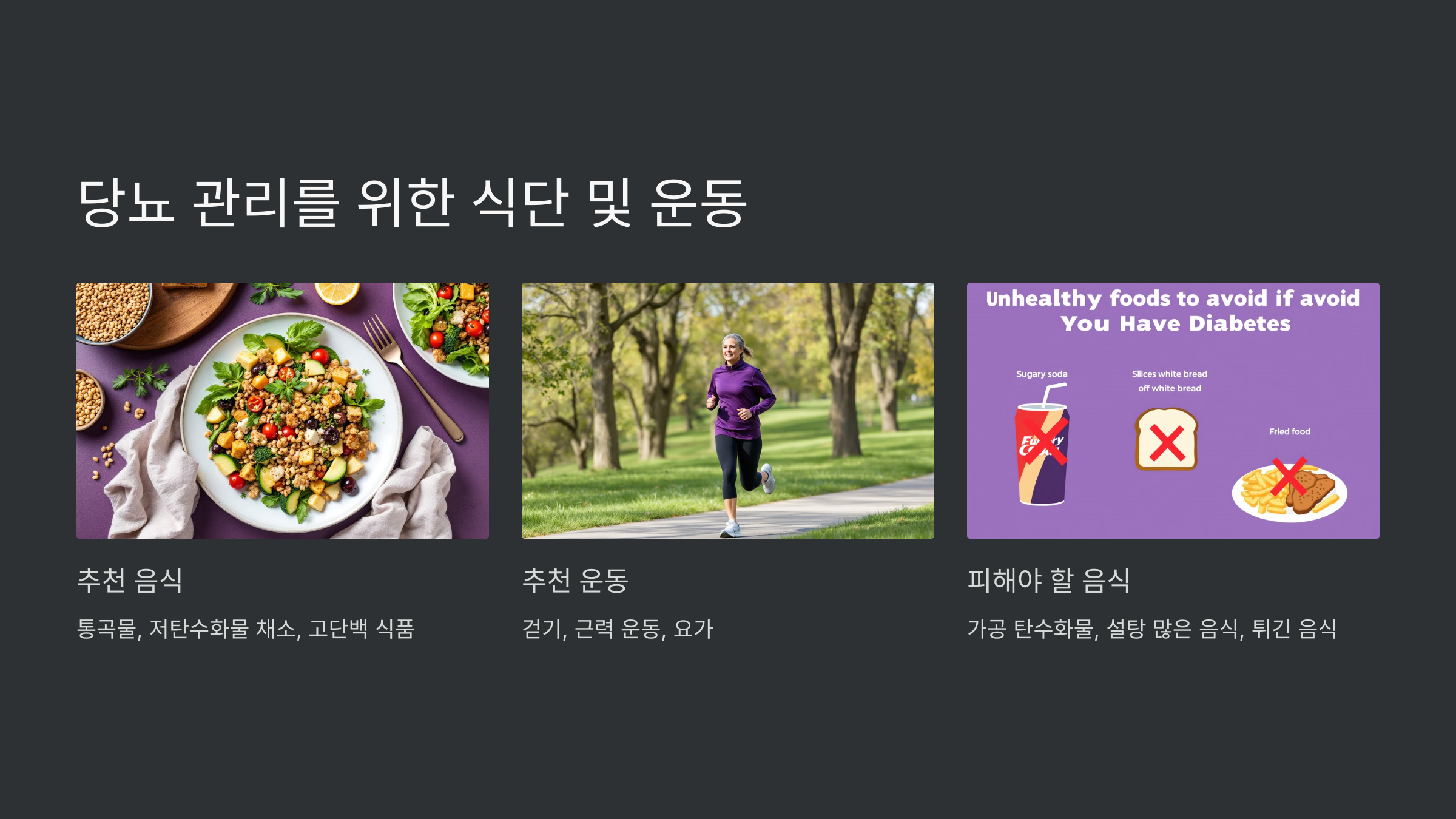 당뇨는 평생 관리가 필요한 질병이지만, 올바른 생활습관으로 충분히 예방하고 조절할 수 있습니다. 건강한 식단과 운동을 꾸준히 실천하면서 혈당을 관리해보세요!