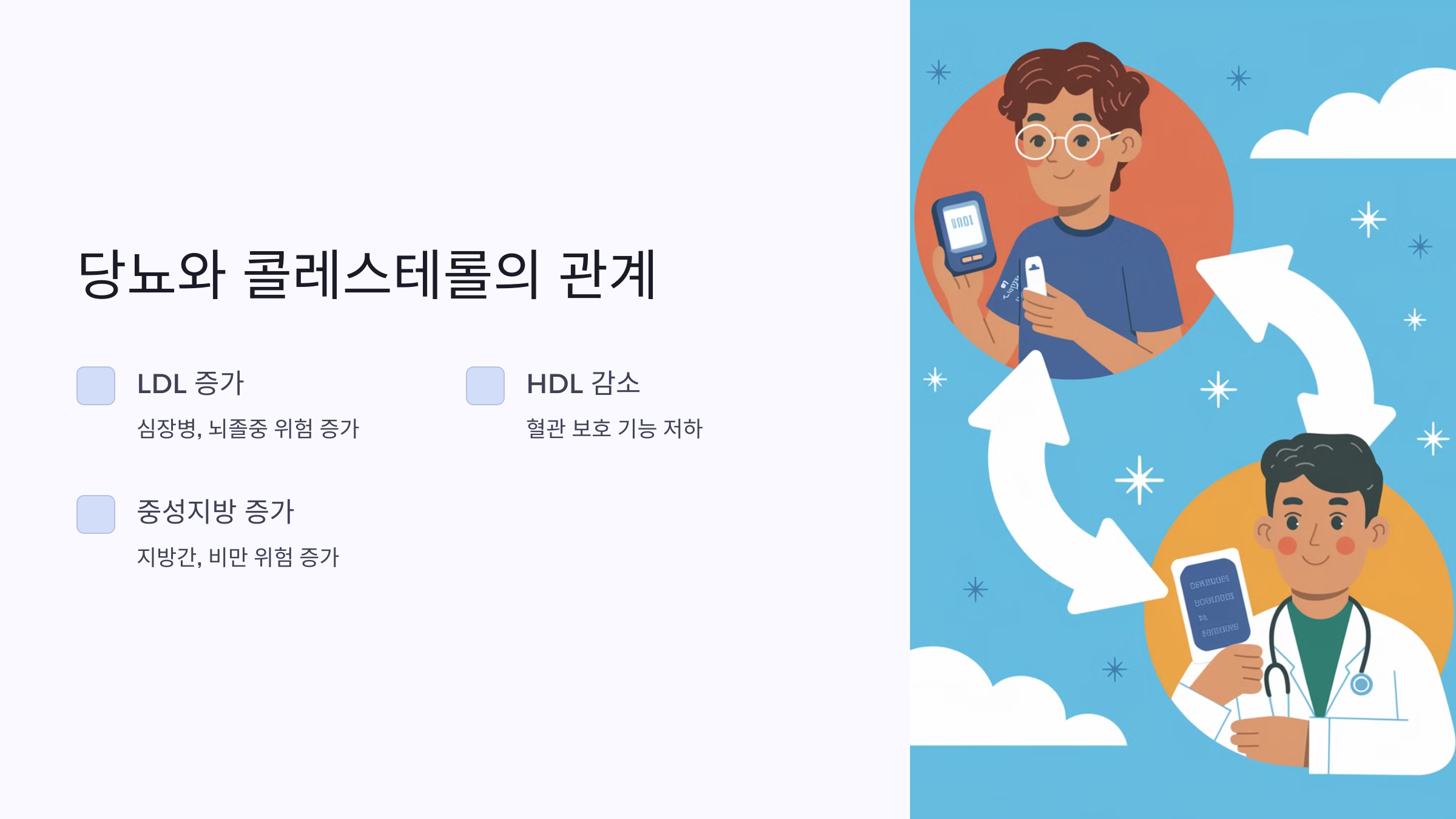 따라서 혈당과 콜레스테롤을 동시에 관리해야 심혈관 질환을 예방할 수 있어요!