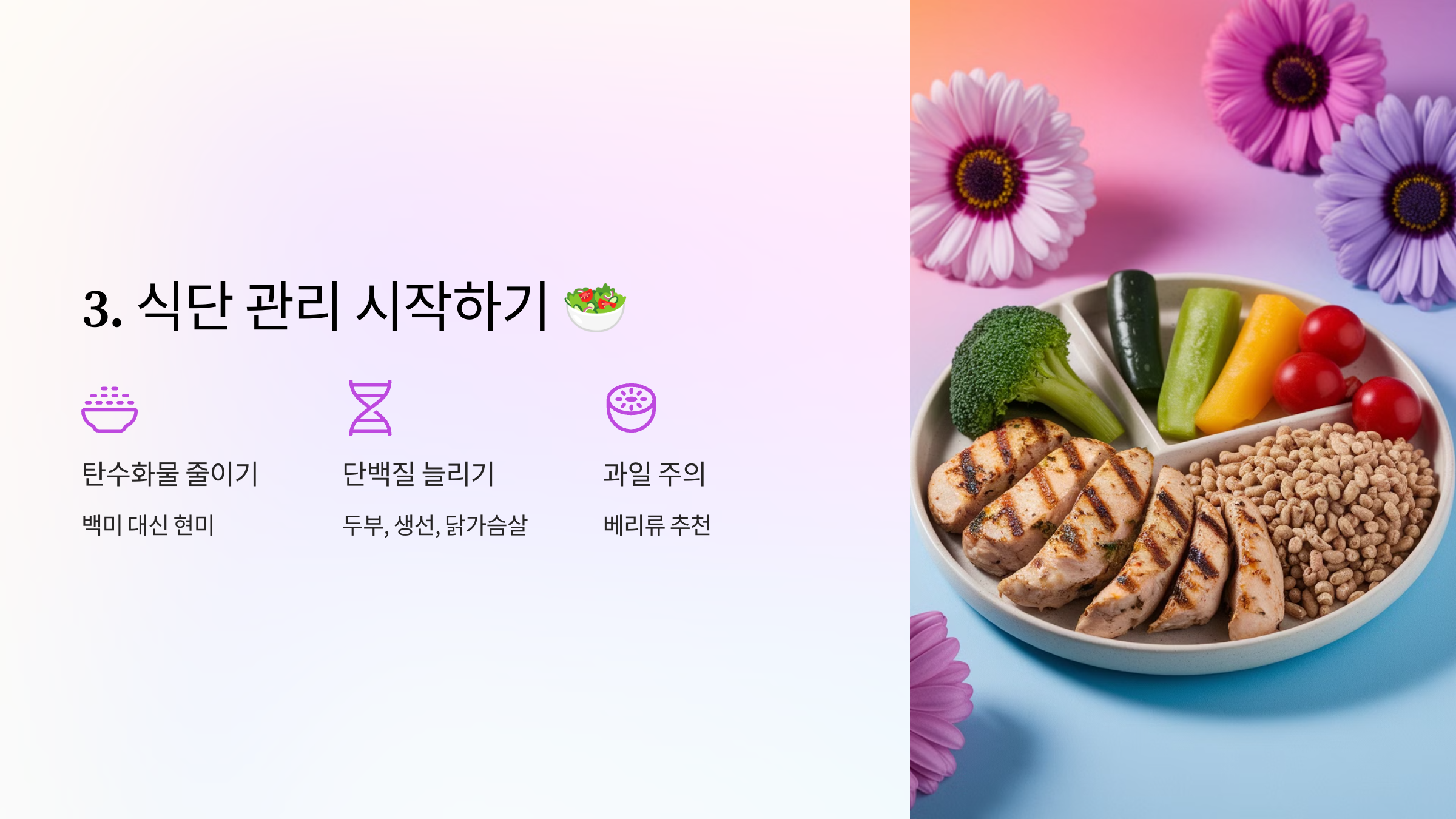- 단백질과 식이섬유 섭취 늘리기 (채소, 두부, 생선, 닭가슴살 등)