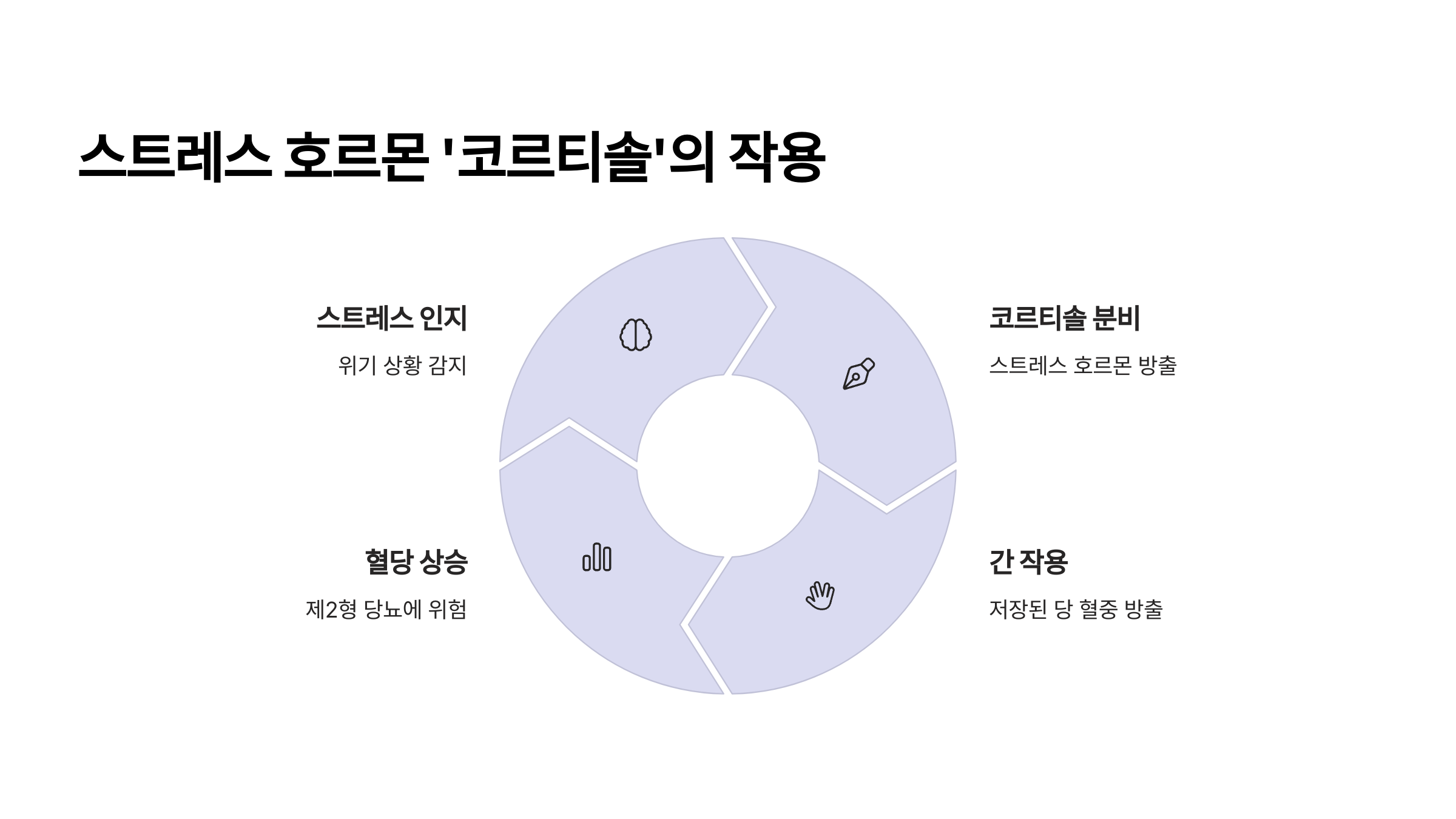 스트레스를 받을 때 분비되는 대표적인 호르몬이 바로 코르티솔입니다. 코르티솔은 간에서 저장된 당을 혈중으로 방출하게 만드는데요, 이는 ‘도망쳐야 하는’ 위기 상황에서 빠른 에너지 공급을 위한 생리적 반응입니다. 문제는 이런 상황이 지속되면, 혈당이 계속 높은 상태를 유지하게 된다는 거죠. 특히 제2형 당뇨인 분들에게는 매우 위험한 상황입니다.