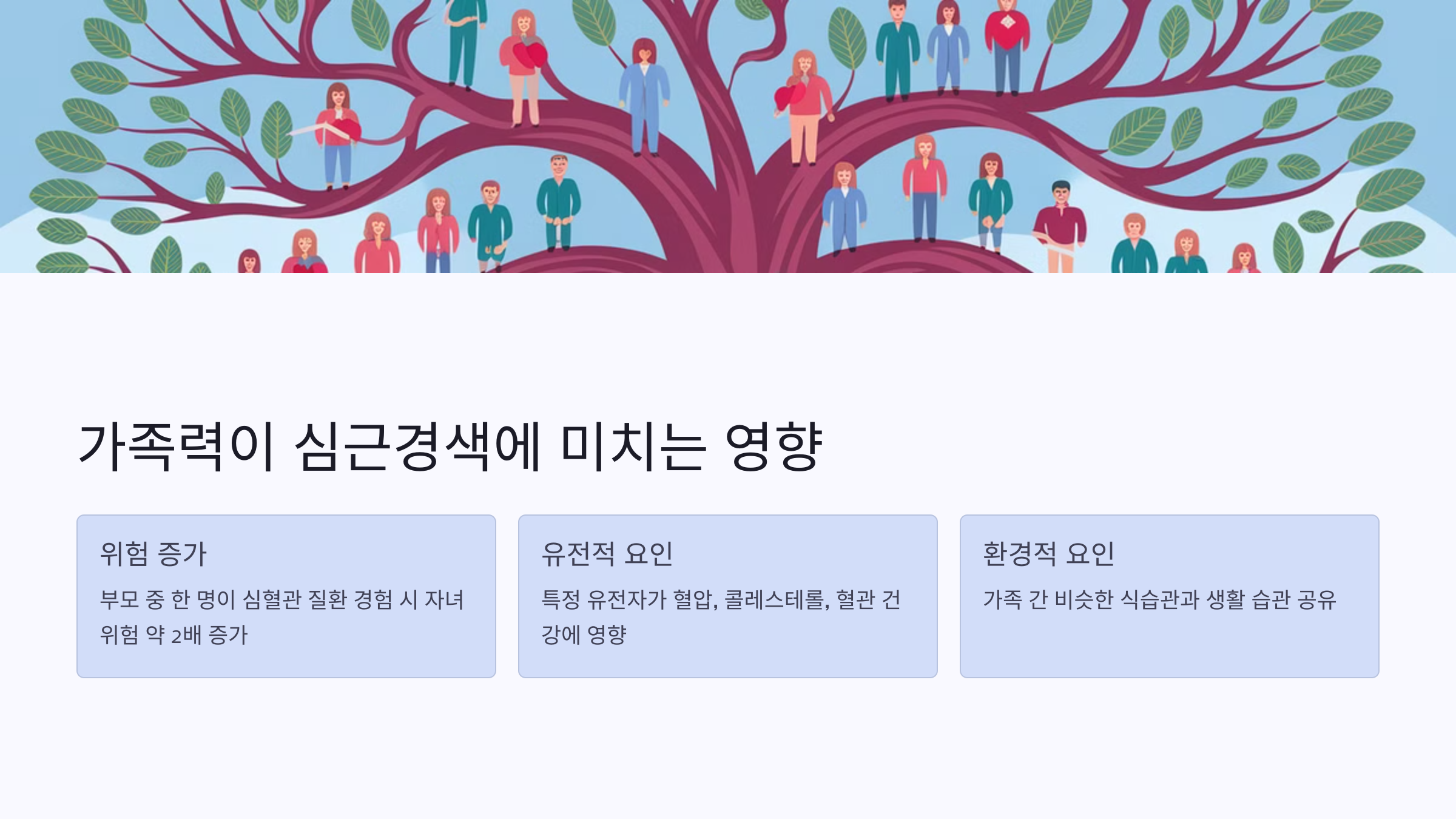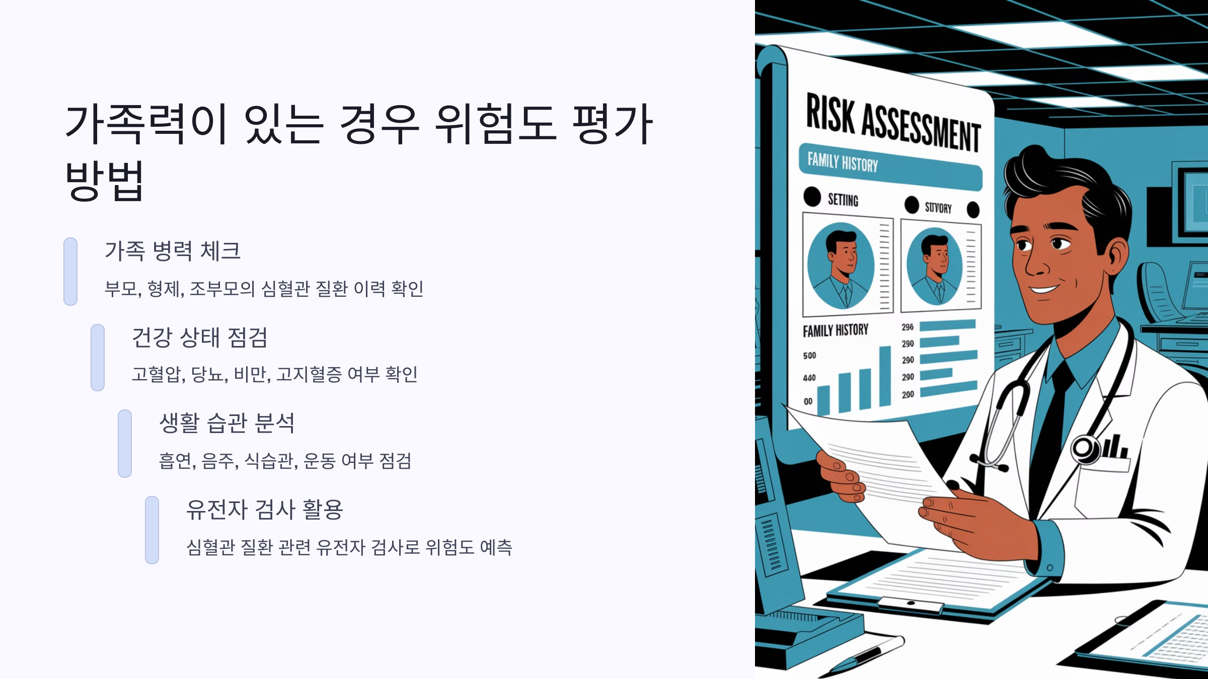 🔎 가족 병력 체크 – 부모, 형제, 조부모 중 심혈관 질환 이력이 있는지 확인.