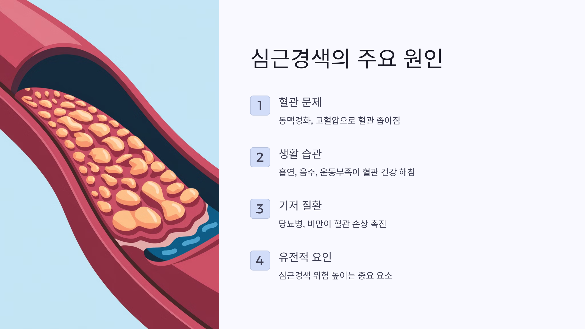 심근경색은 관상동맥이 막혀 심장 근육이 괴사 하는 질환입니다. 원인은 다양하지만, 대표적인 요인은 다음과 같습니다.