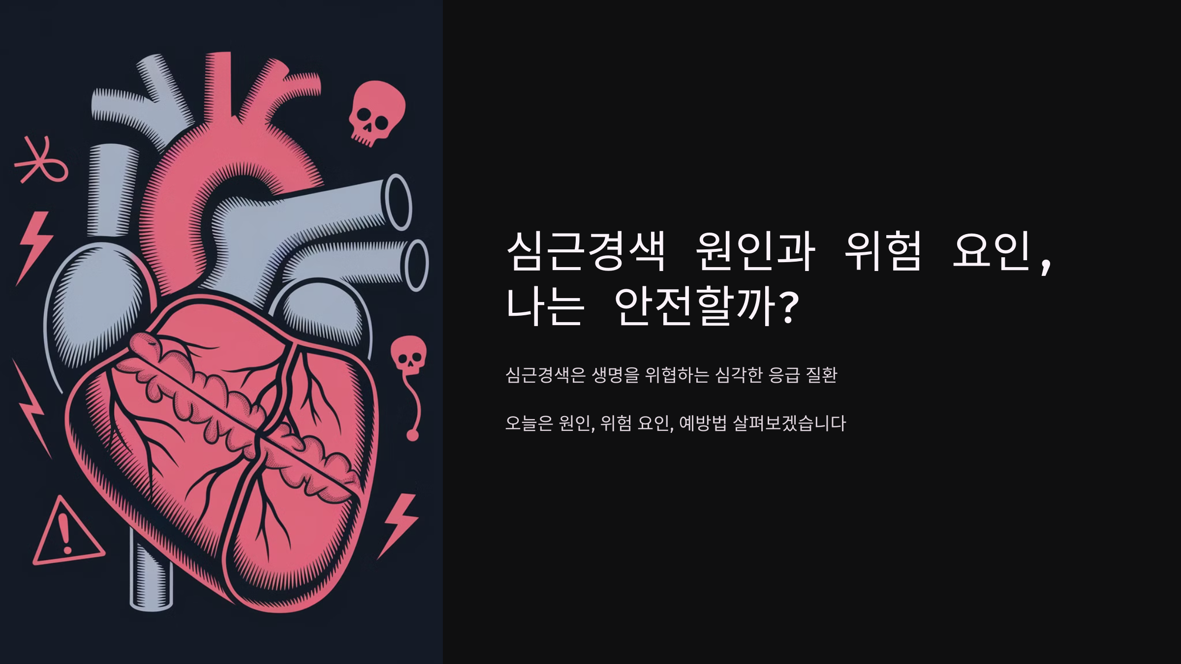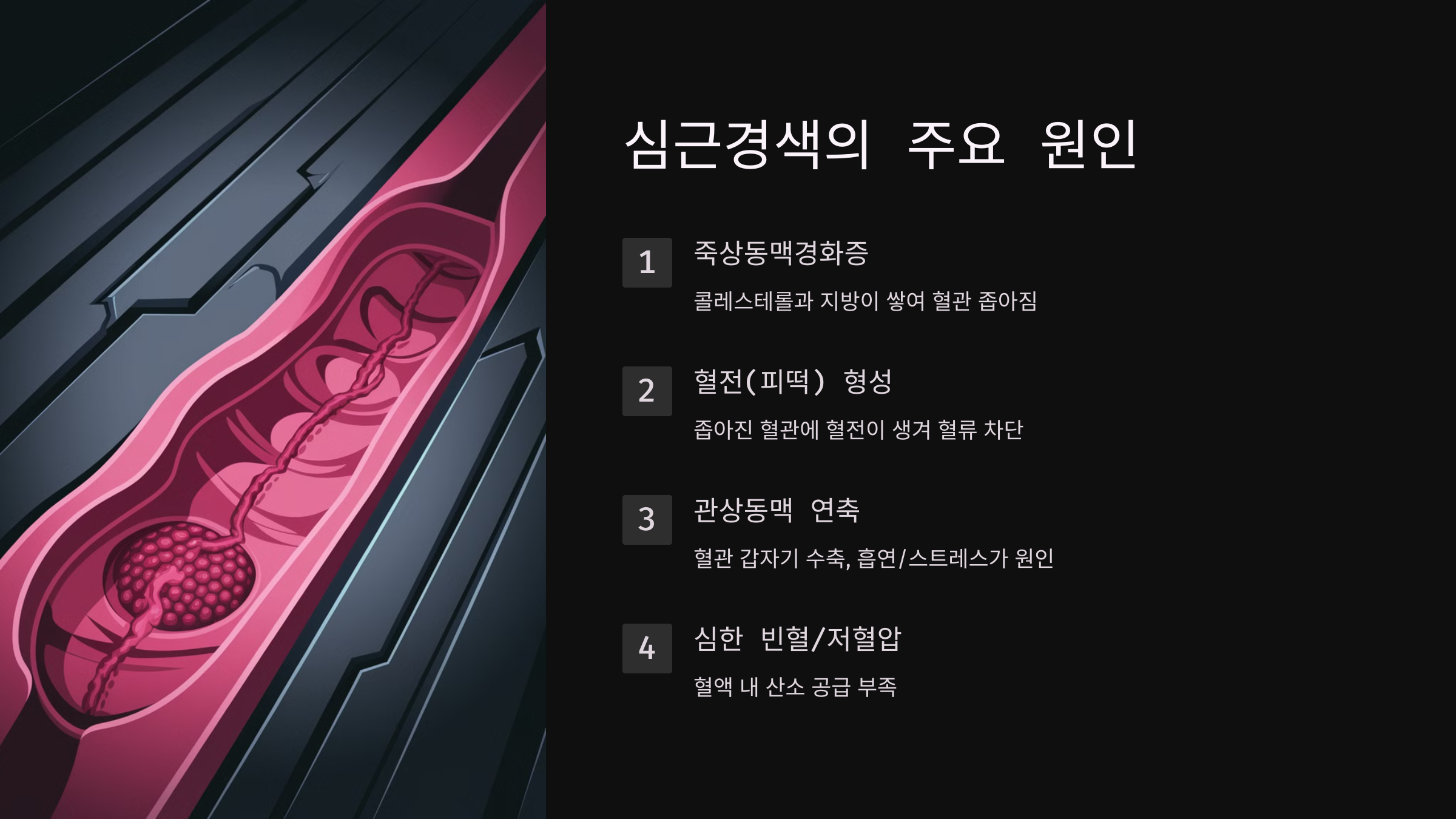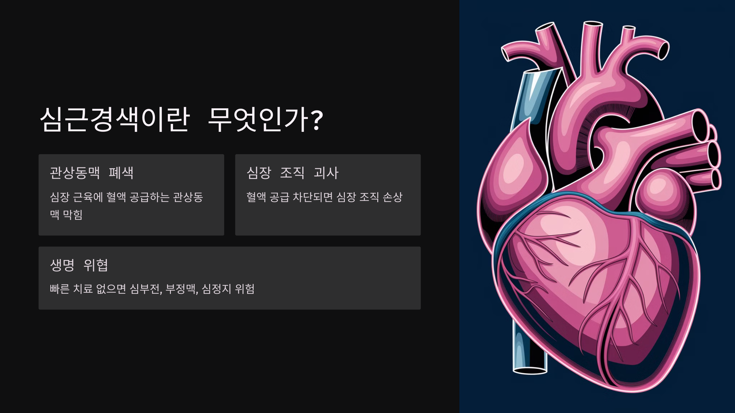 심근경색은 심장 근육에 혈액을 공급하는 관상동맥이 막혀 심장 조직이 괴사 하는 질환입니다. 심장은 몸 전체로 혈액을 보내는 중요한 역할을 하는데, 혈액 공급이 차단되면 심장 조직이 손상되면서 생명을 위협할 수 있습니다.