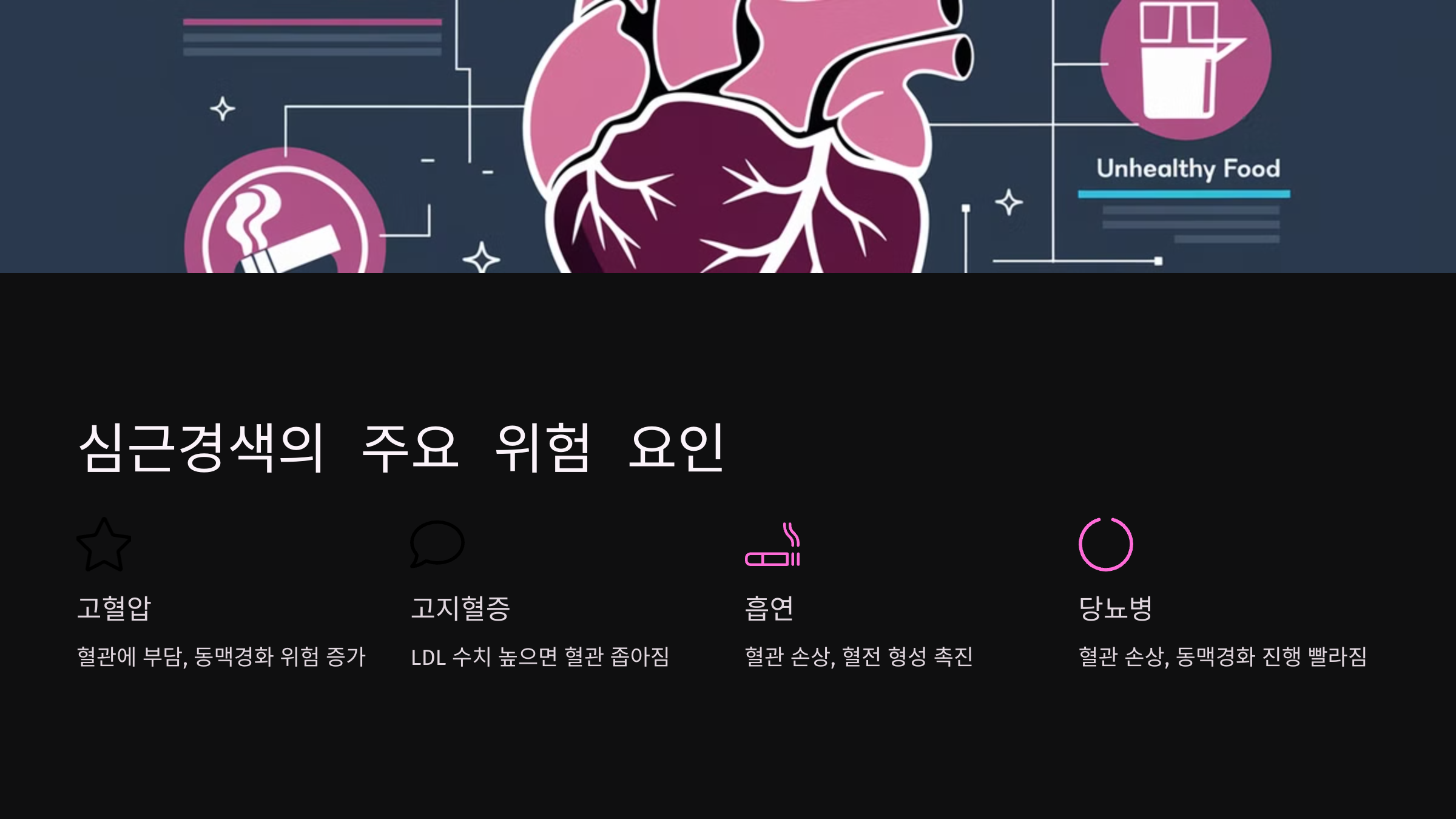 - 동맥에 콜레스테롤과 지방이 쌓이면서 혈관이 좁아지는 현상입니다.
