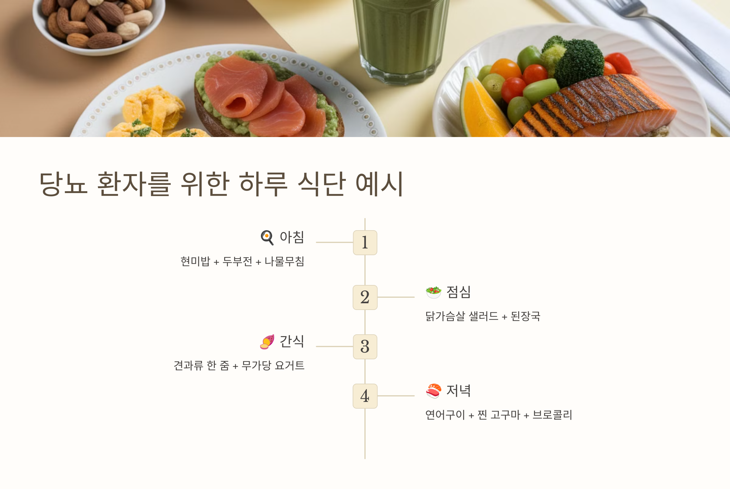 탄수화물(50%) + 단백질(30%) + 건강한 지방(20%)의 비율을 유지하면 혈당을 안정적으로 관리할 수 있어요.