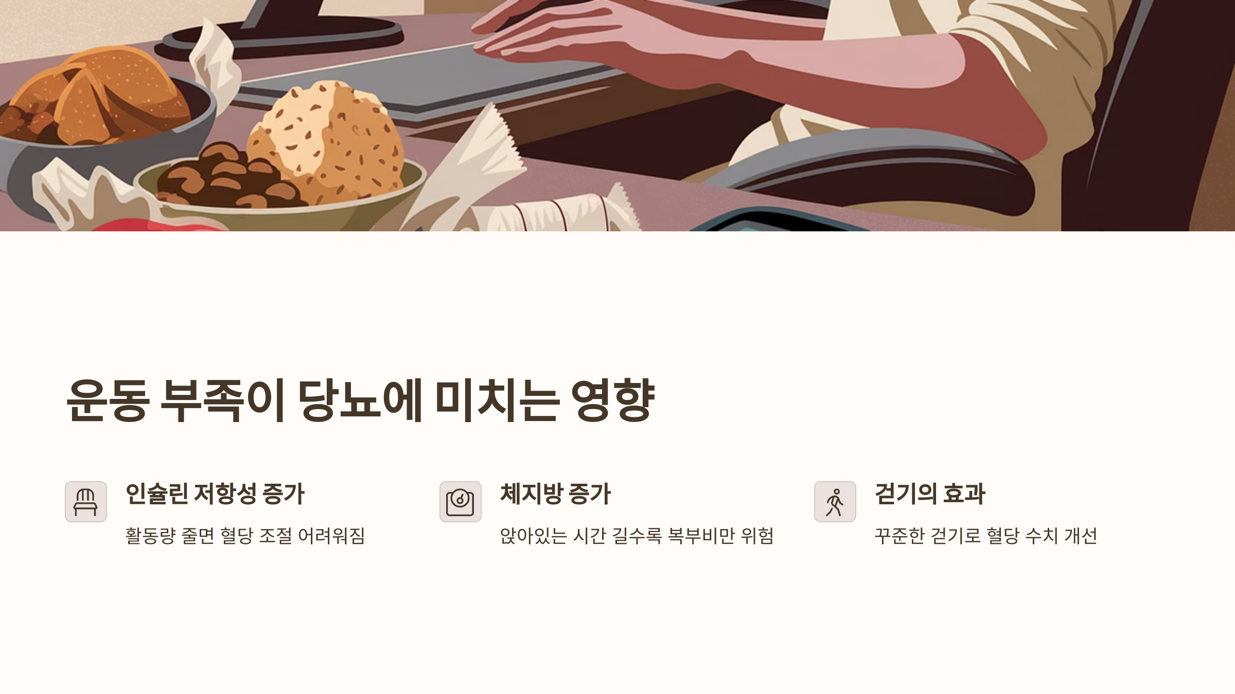 운동 부족은 당뇨의 주범 중 하나입니다. 활동량이 줄면 인슐린 저항성이 증가하면서 혈당 조절이 어려워져요. 특히 앉아서 보내는 시간이 길수록 체지방이 늘고, 복부비만으로 이어져 당뇨 위험이 더 커집니다. 앉아만 일하다 보면 혈당수치가 많이 올라갈 수 있습니다. 걷기라도 꾸준히 해주면 확실히 수치가 달라지는 걸 느꼈습니다!