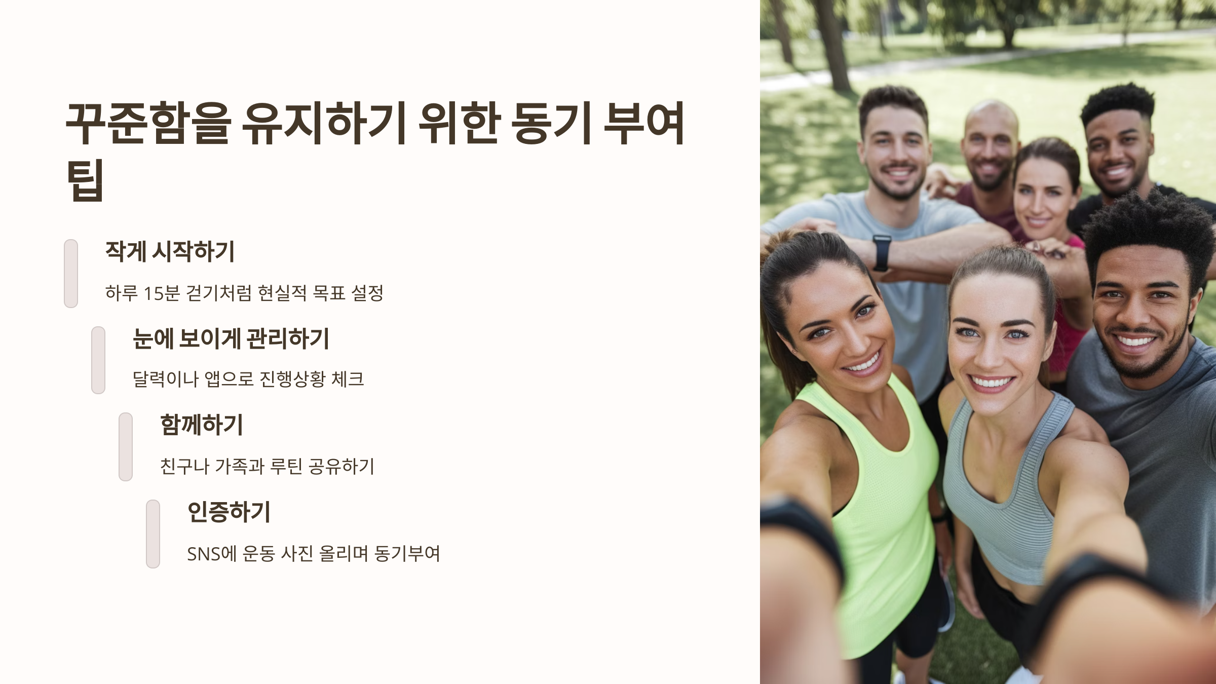 습관은 작게 시작하고, 눈에 보이게 관리하면 유지가 쉬워요. 목표를 너무 높게 잡기보단 ‘하루 15분 걷기’처럼 현실적인 수준에서 시작해 보세요. 그리고 친구나 가족과 함께 루틴을 공유하면 훨씬 더 동기부여가 됩니다! 저는 SNS에 매일 운동 사진을 올리며 인증하는데, 누가 보기 시작하면 스스로 포기하기 싫어지실 겁니다 😄