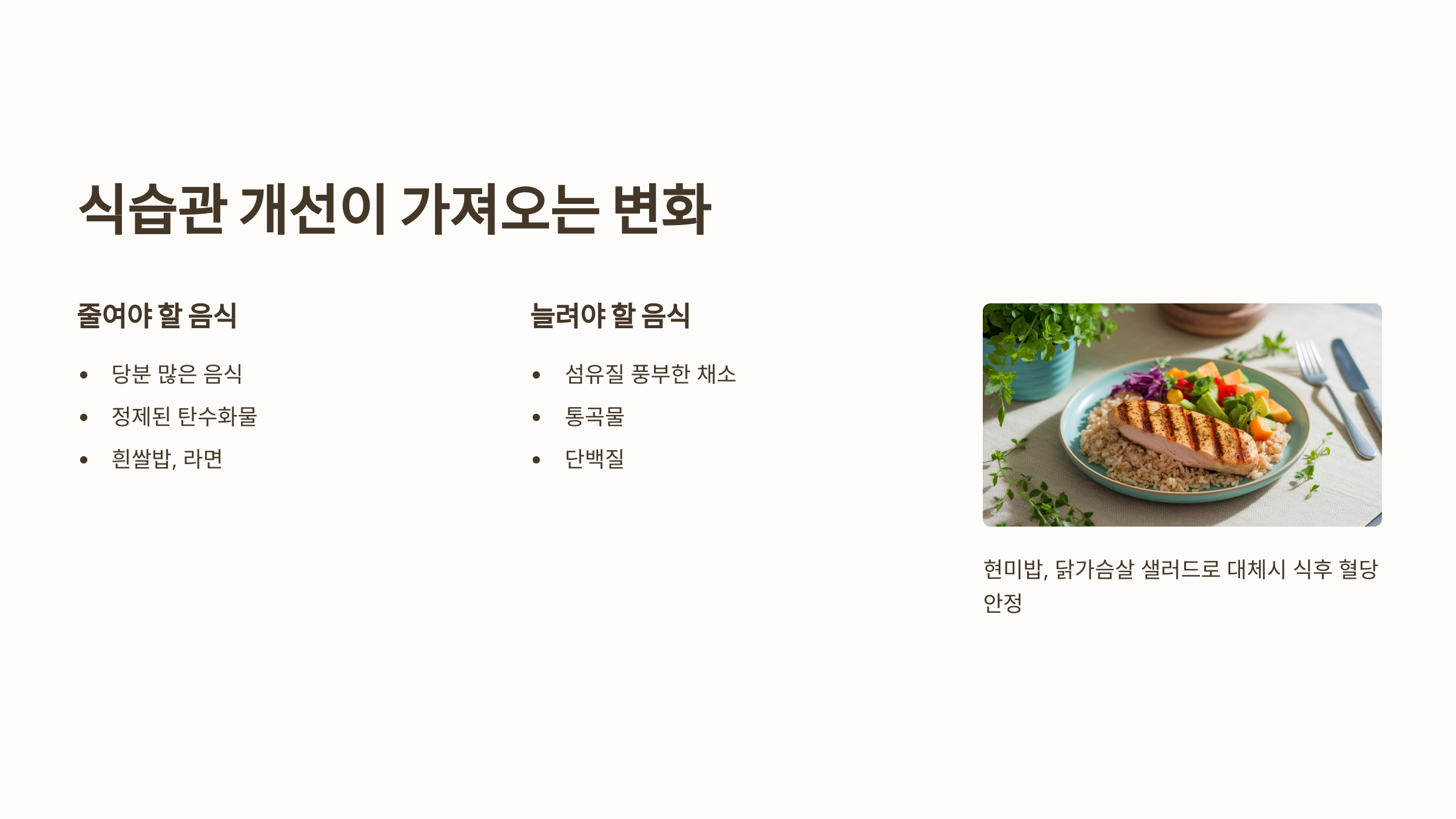 당뇨 환자에게 식습관은 절대 빼놓을 수 없죠. 당분이 많은 음식, 정제된 탄수화물은 줄이고, 대신 섬유질이 풍부한 채소, 통곡물, 단백질을 충분히 섭취하는 게 중요해요. 흰쌀밥 대신 현미밥, 라면 대신 닭가슴살 샐러드로 대체하면 식후 혈당이 훨씬 덜 오르게 될 겁니다. 작은 변화 하나가 건강에 큰 영향을 주는 걸 몸소 느껴보세요!