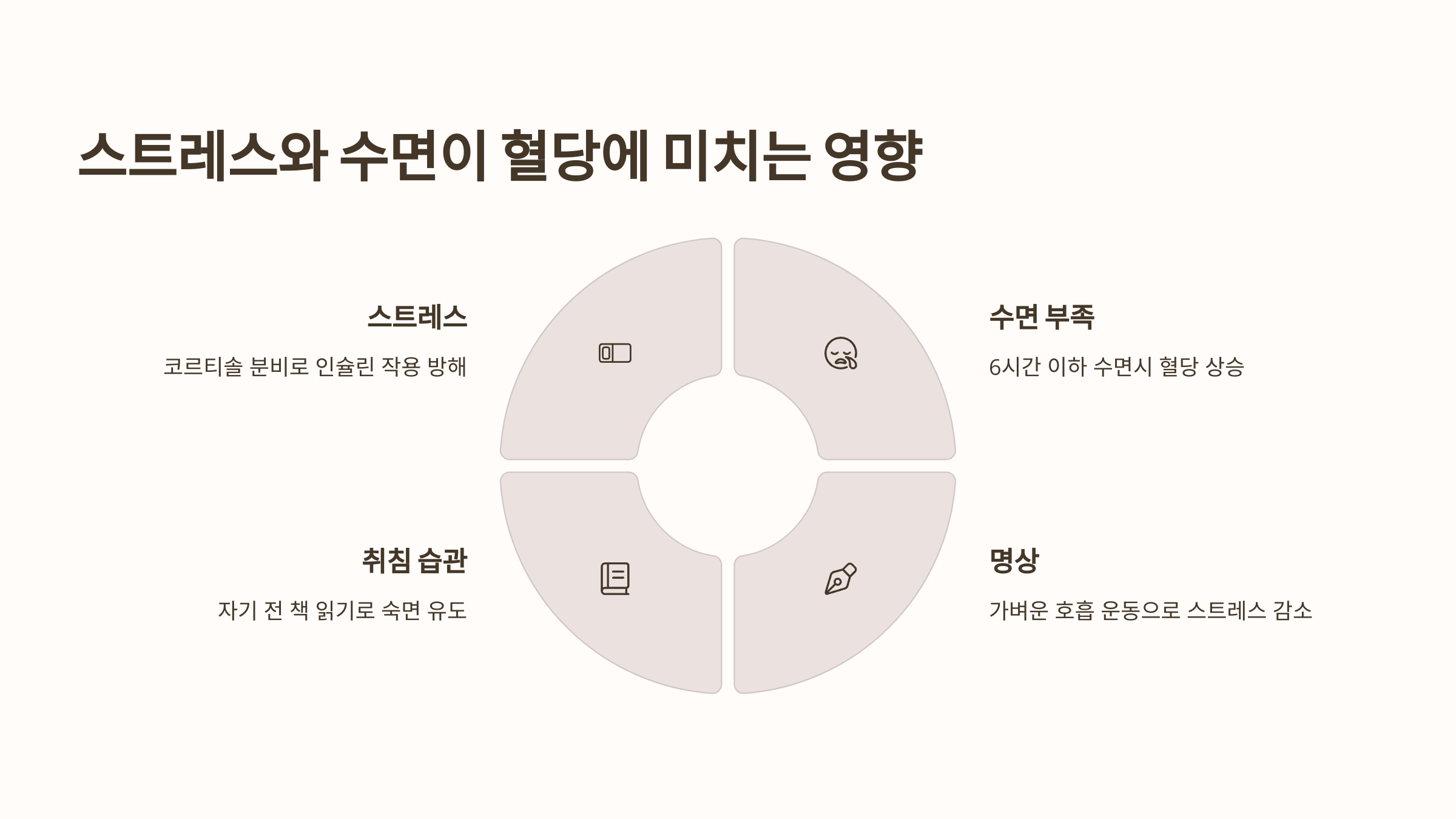 스트레스와 수면 부족도 혈당 상승의 원인이 됩니다. 특히 스트레스가 심하면 코르티솔이 분비되어 인슐린 작용을 방해하죠. 또, 수면 시간이 6시간 이하일 경우 혈당이 잘 안 내려가는 경향도 있어요. 명상이나 가벼운 호흡 운동, 수면 전 휴대폰 멀리하기 등으로 숙면을 유도해 보세요. 💤