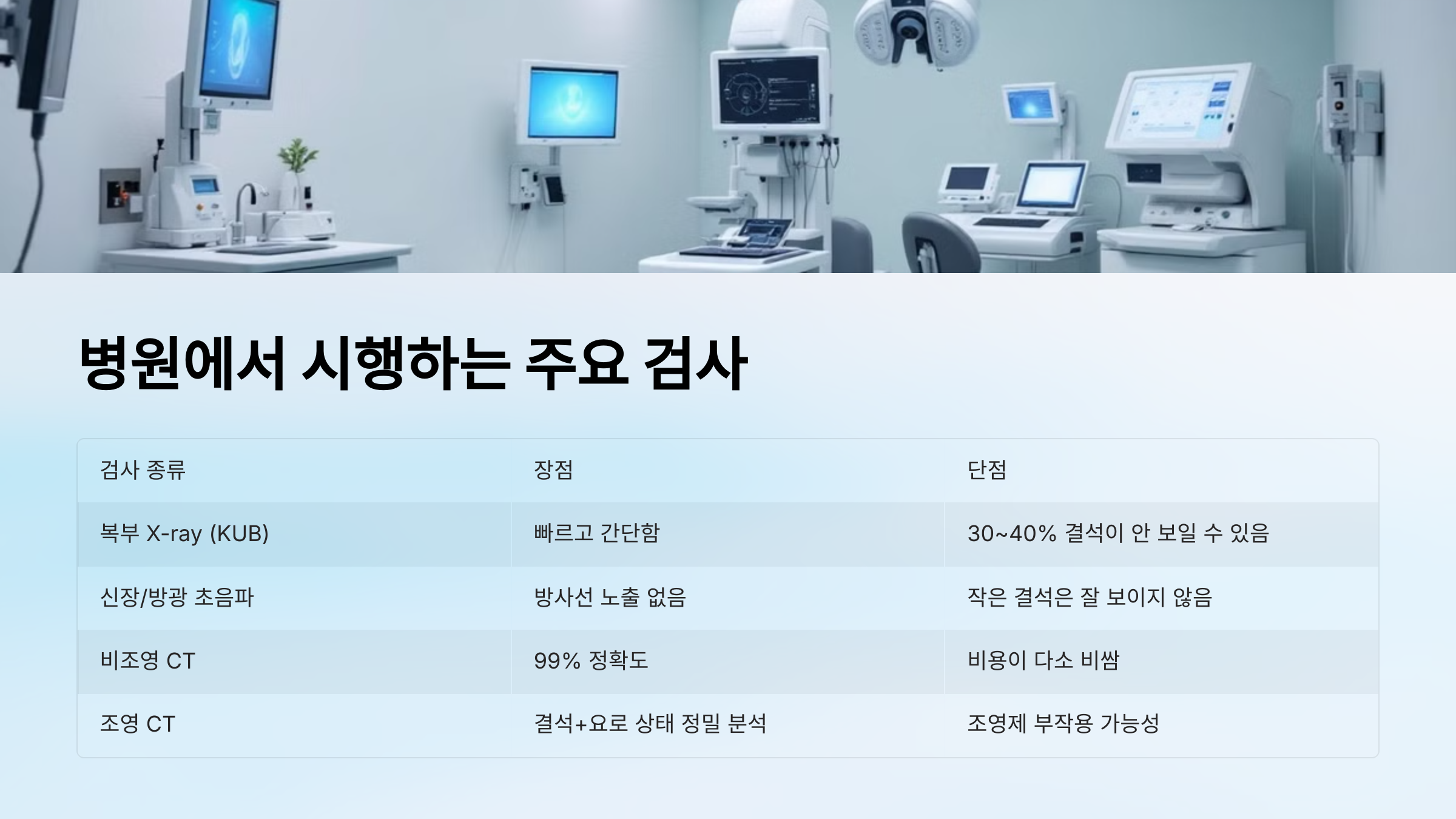 | 복부 X-ray (KUB 촬영) | 빠르고 간단함 | 30~40% 결석이 안 보일 수 있음 |