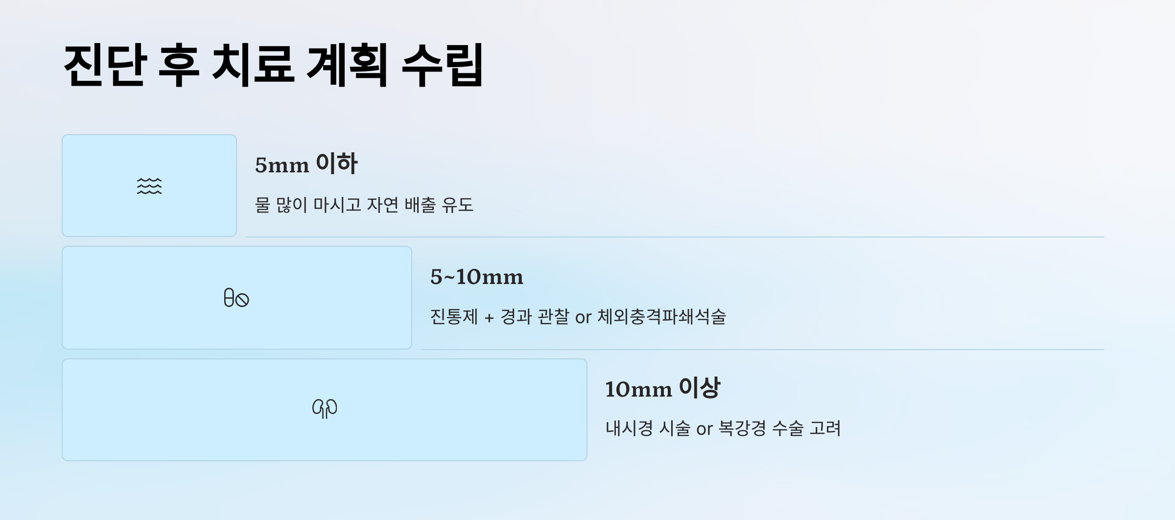 | 5~10mm | 진통제 복용 + 경과 관찰 or 체외충격파쇄석술(ESWL) |