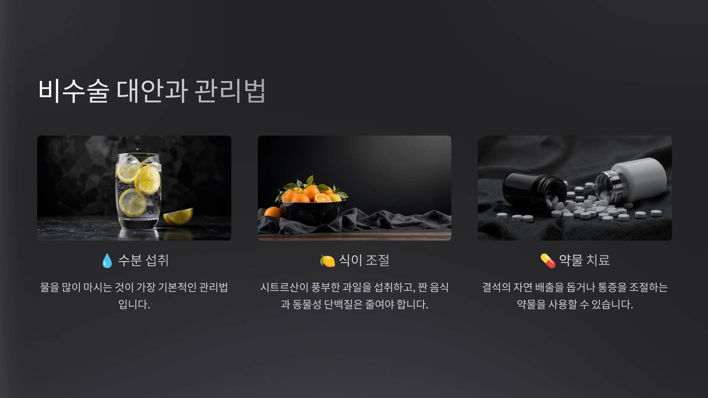 수분 섭취, 식습관 개선, 정기적인 검진이 필수입니다.