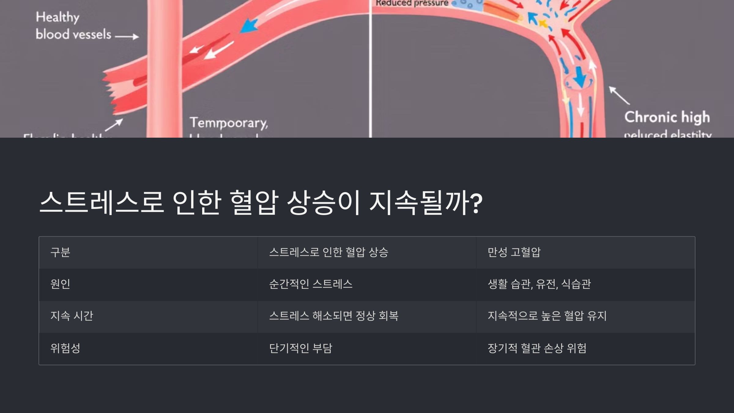 | 지속 시간 | 스트레스가 해소되면 정상 회복 | 지속적으로 높은 혈압 유지 |