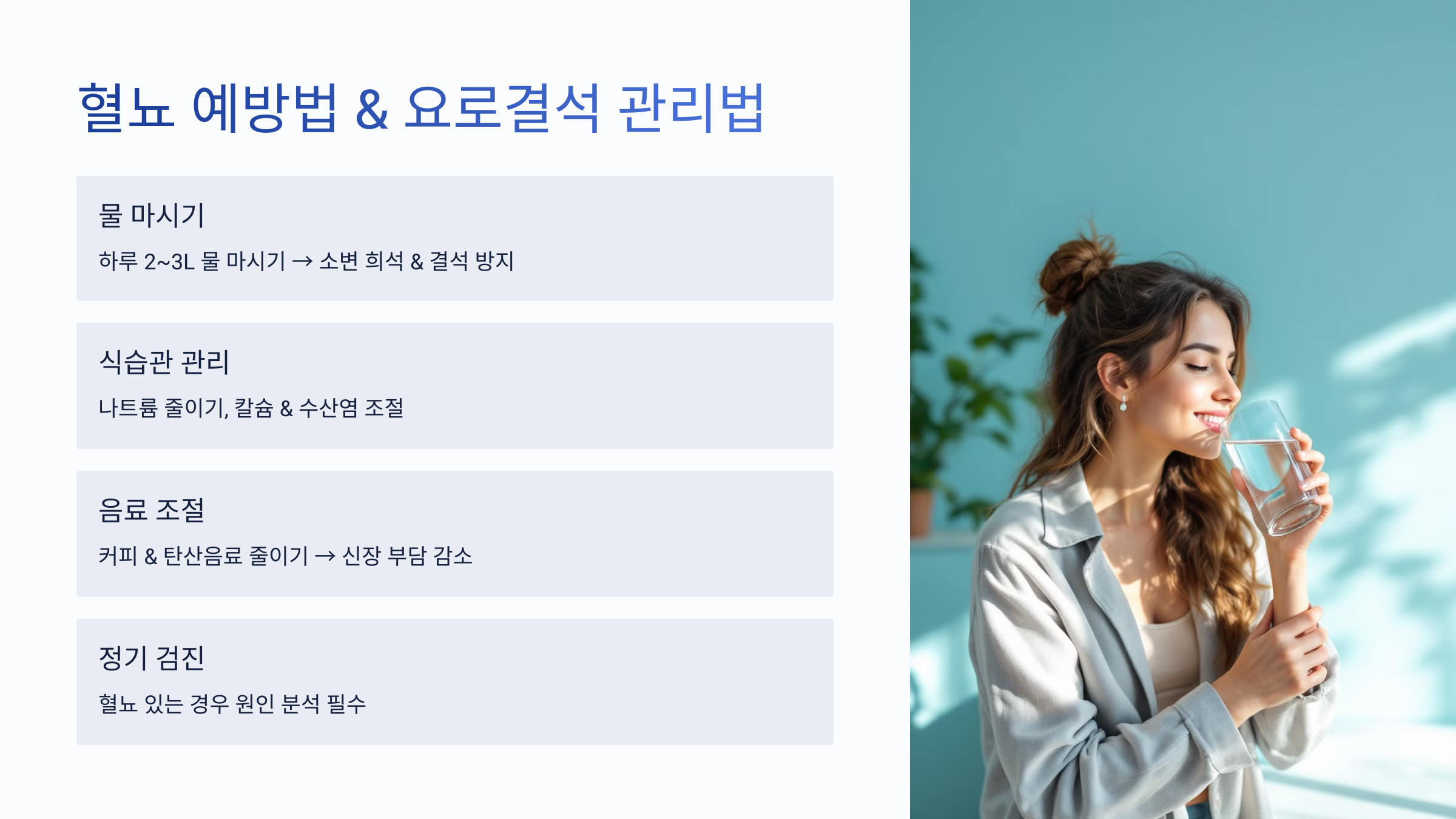 ✅ 하루 2~3L 물 마시기 💧 → 소변 희석 효과 & 결석 형성 방지