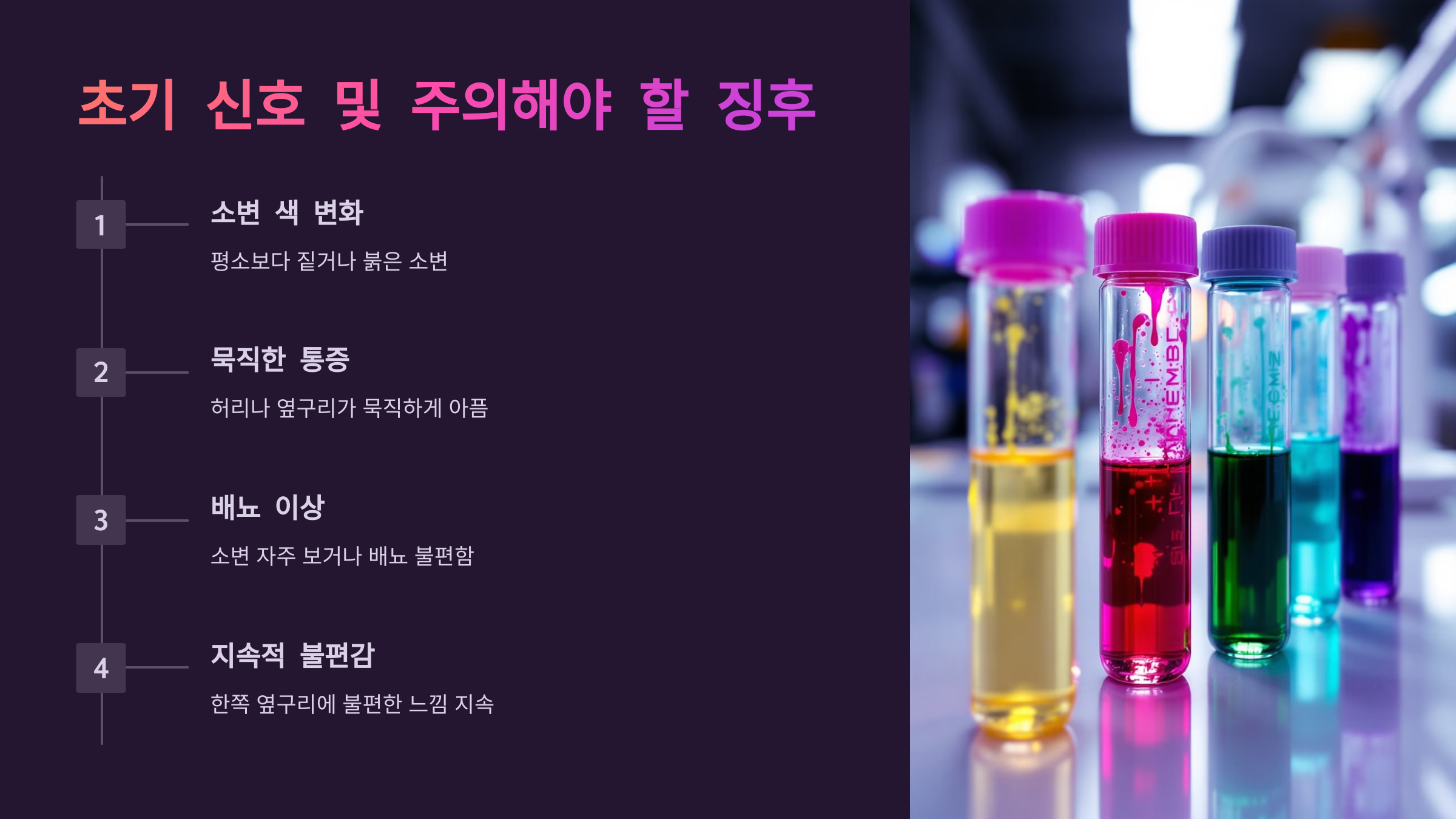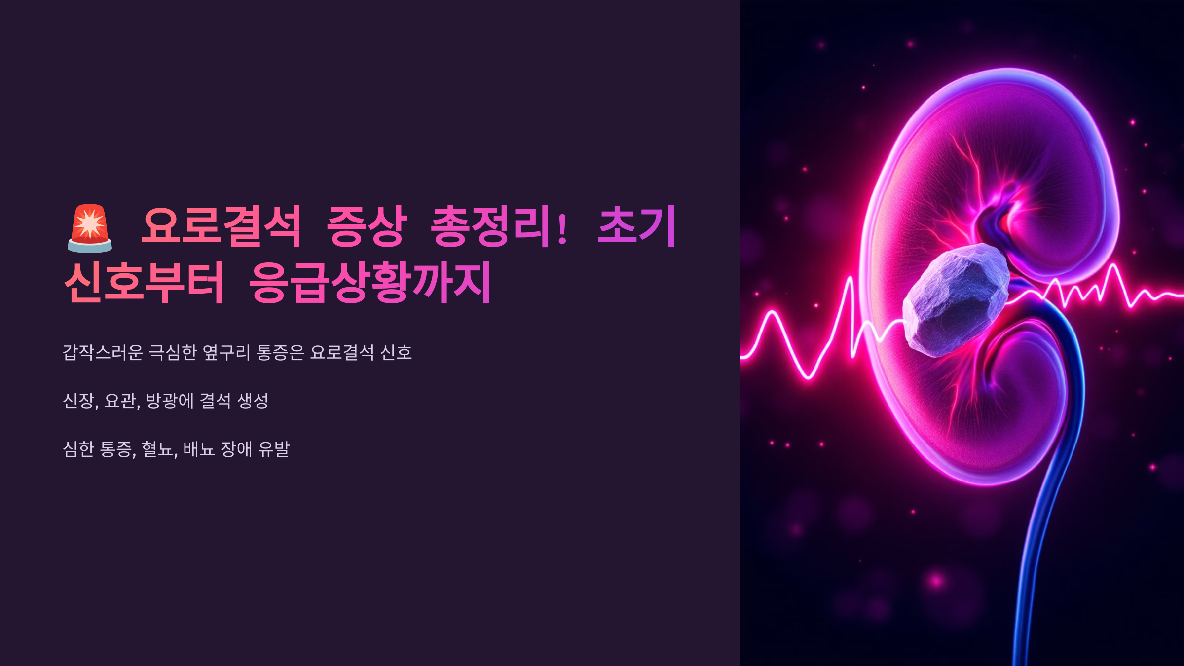 갑작스러운 극심한 옆구리 통증이 있다면? 요로결석을 의심해야 합니다! 🩺 요로결석은 신장, 요관, 방광 등에 결석(돌)이 생기는 질환으로, 초기에는 별다른 증상이 없다가 심한 통증과 혈뇨, 배뇨 장애를 유발할 수 있습니다. 오늘은 요로결석의 증상과 초기 신호, 응급상황 대처법까지 자세히 알려드릴게요!