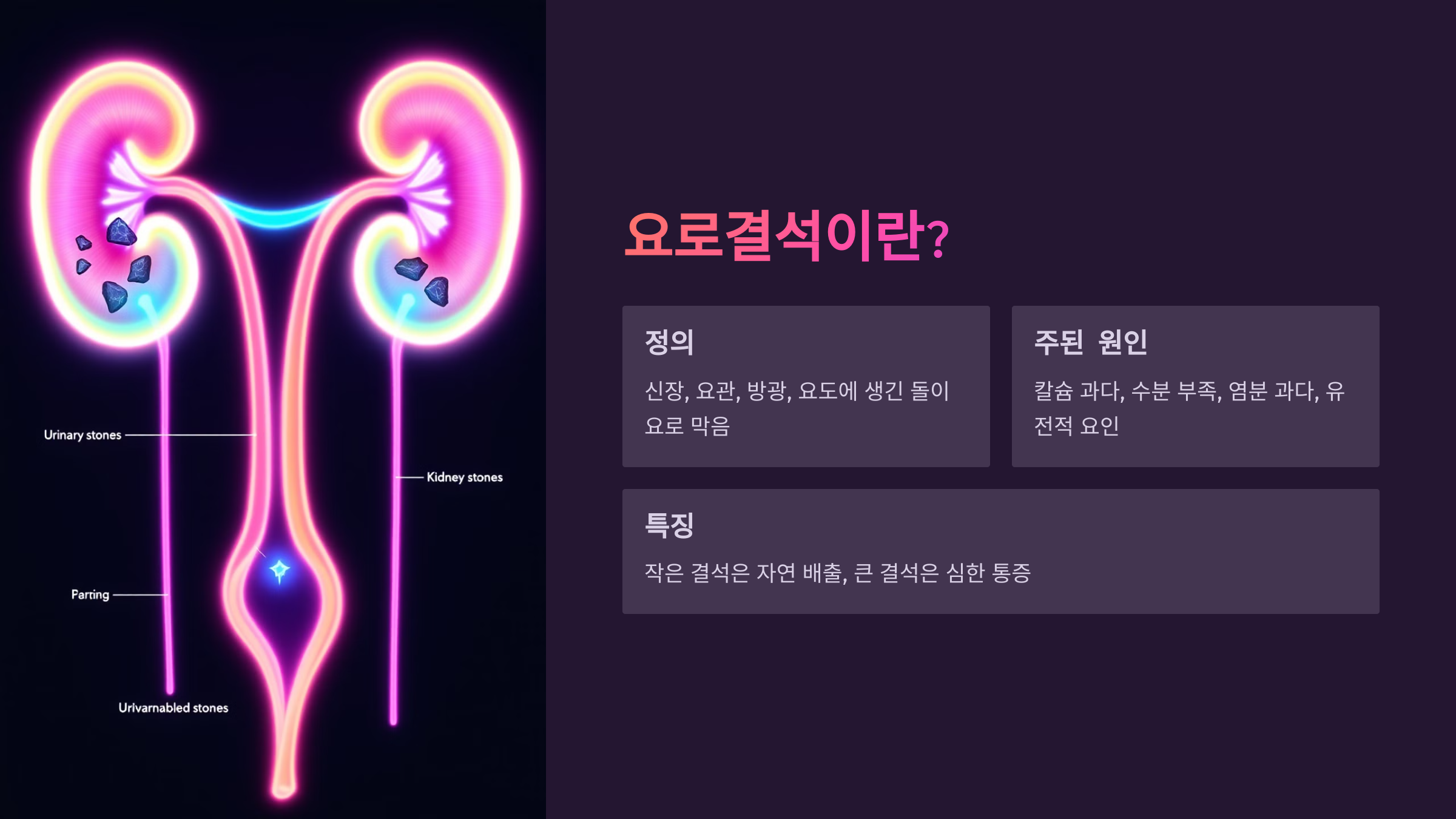 💡 결석이 요관을 막으면 극심한 통증이 발생하며, 신장 기능에도 영향을 줄 수 있습니다!