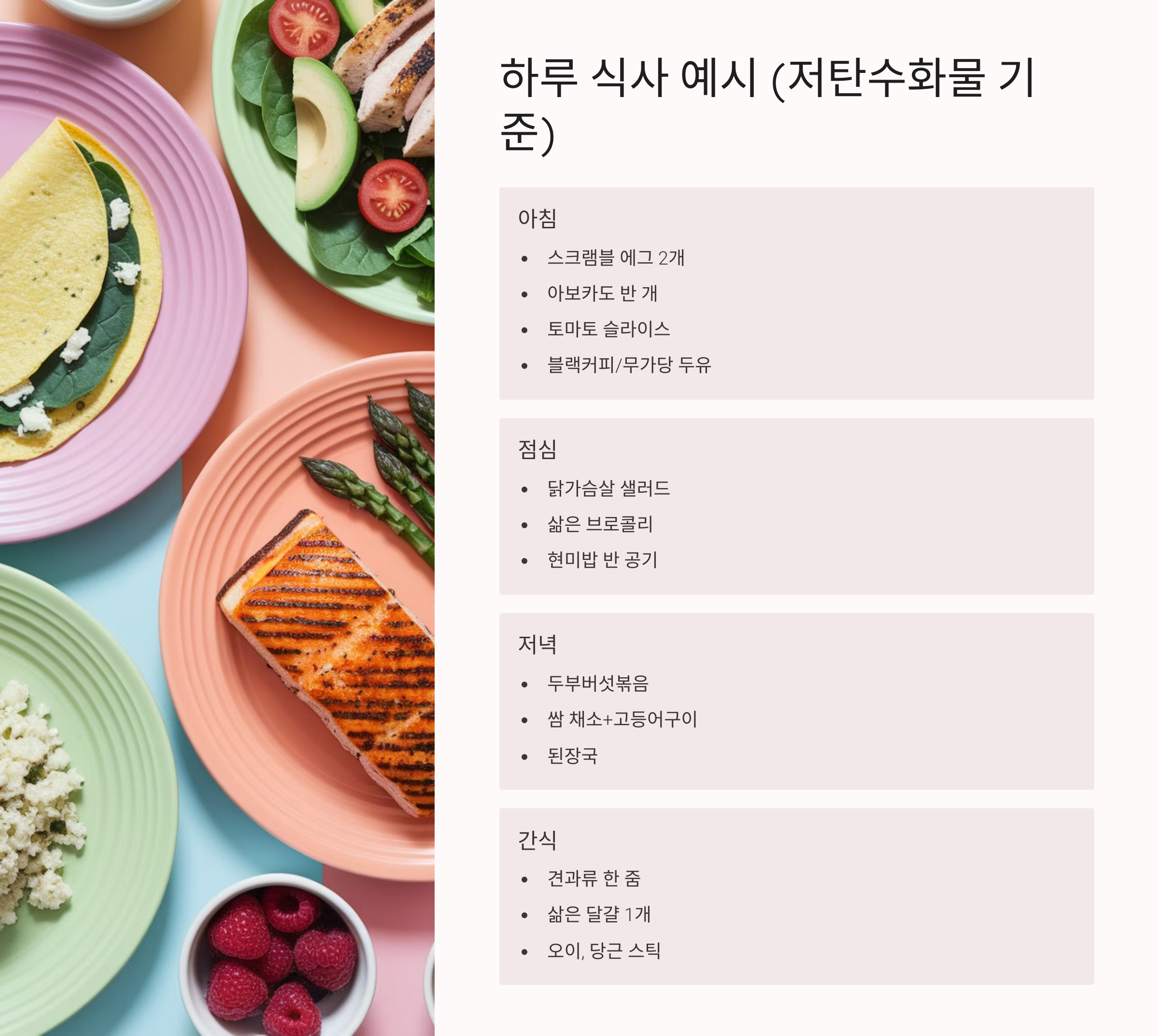 저탄수화물 식단으로 혈당을 안정시키고, 건강한 삶의 루틴을 만들어보세요.