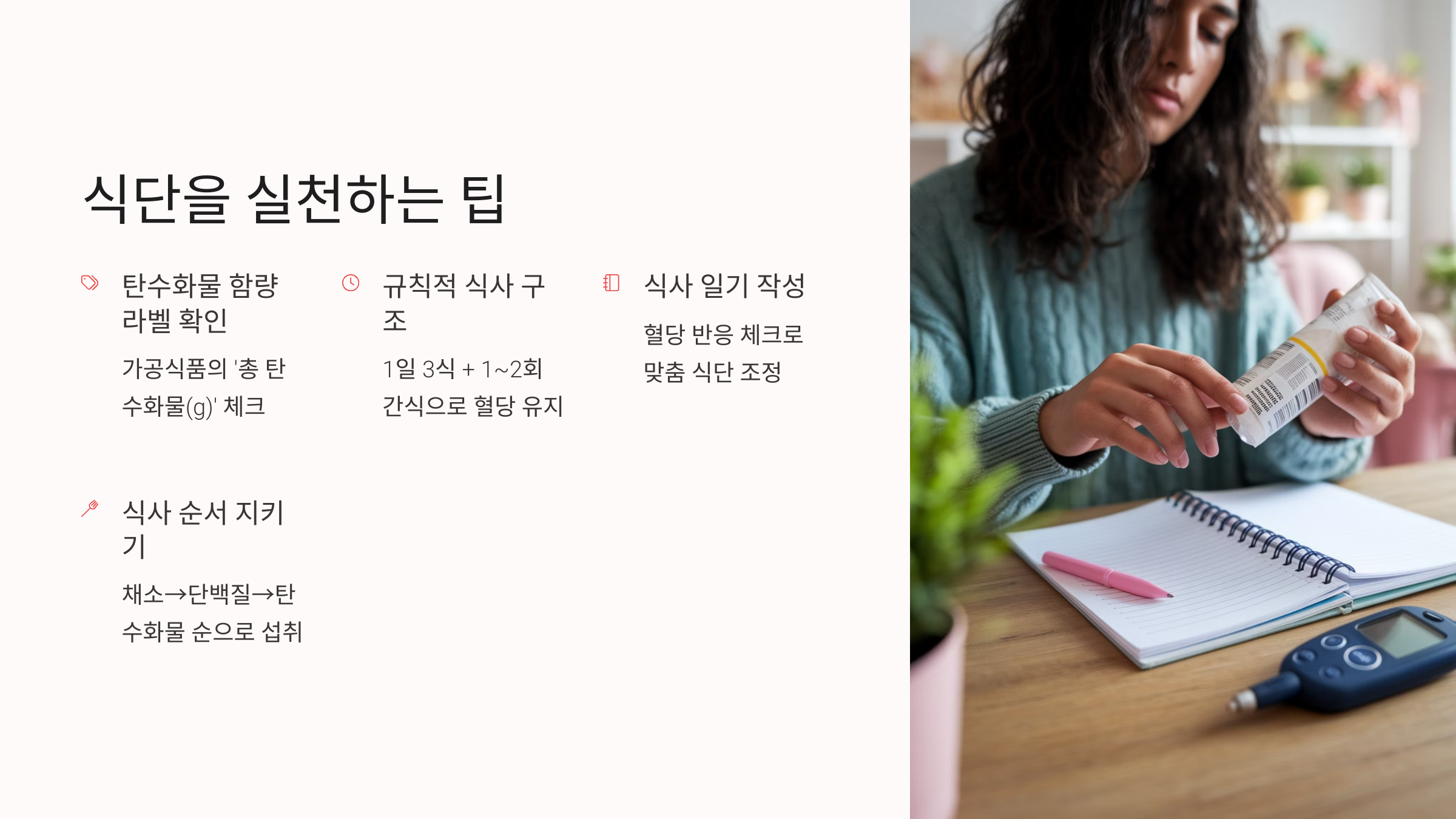 - 탄수화물 함량 라벨 확인: 가공식품 섭취 시 ‘총 탄수화물(g)’ 체크