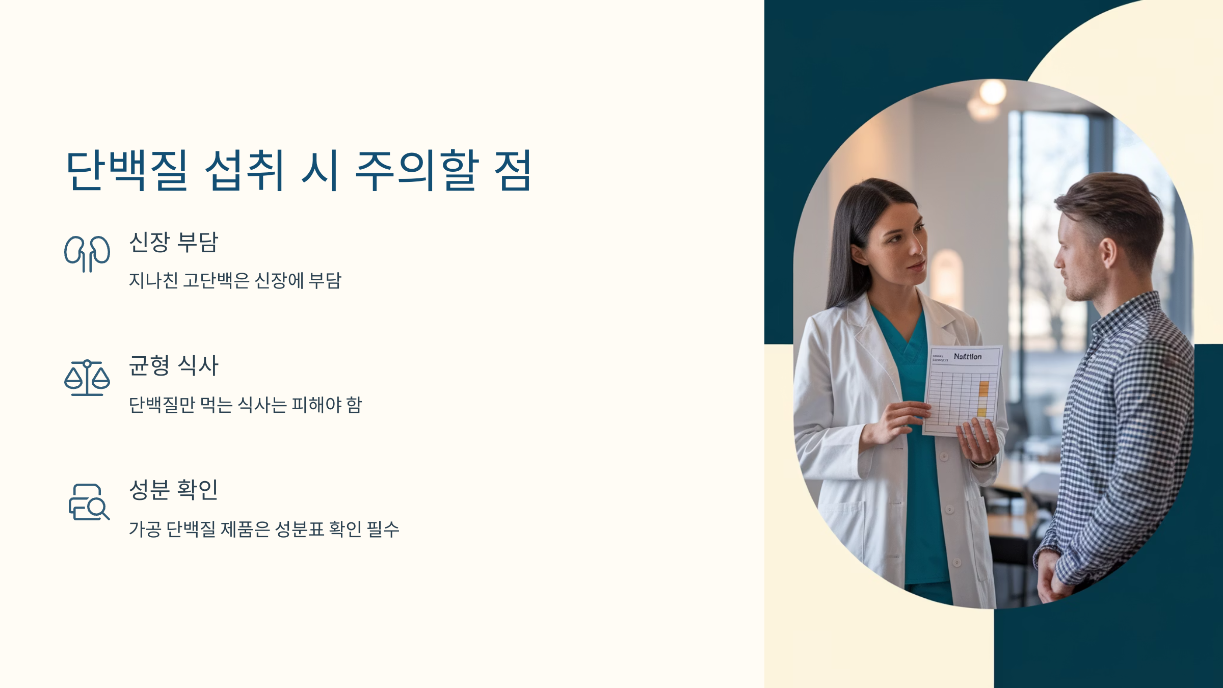 - 지나친 고단백 식단은 신장 부담 가능 → 특히 당뇨 합병증이 있는 경우 신장 수치 확인 필수