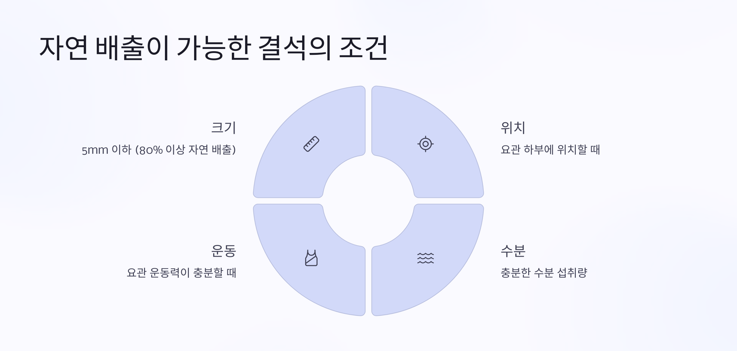 수분 섭취는 결석을 밀어내는 요로 흐름을 증가시켜 자연 배출 확률을 높입니다.