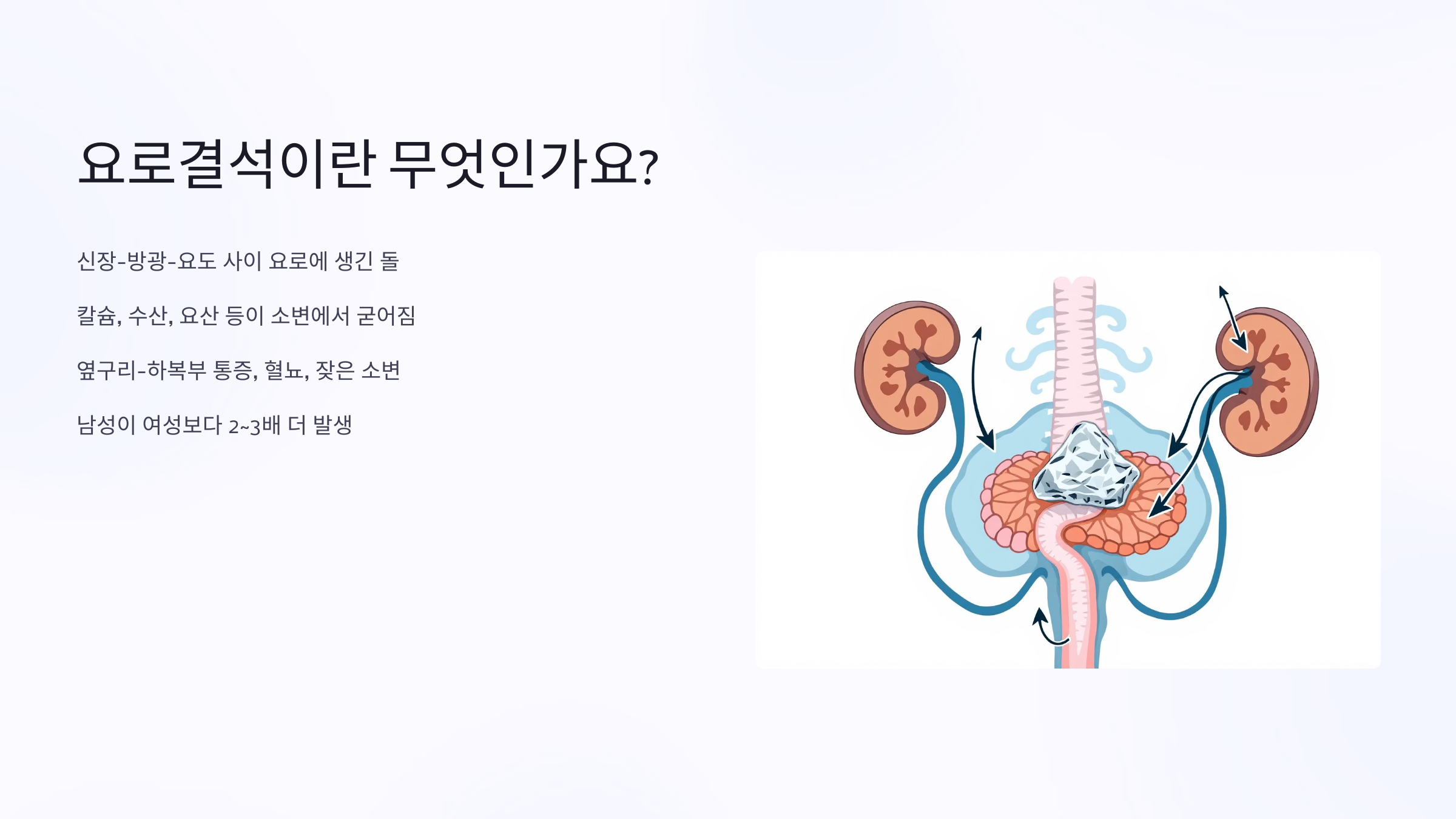 특히 옆구리에서 하복부까지 퍼지는 통증, 혈뇨, 잦은 소변 등의 증상이 흔하며, 남성이 여성보다 약 2~3배 더 잘 생기는 질환입니다.