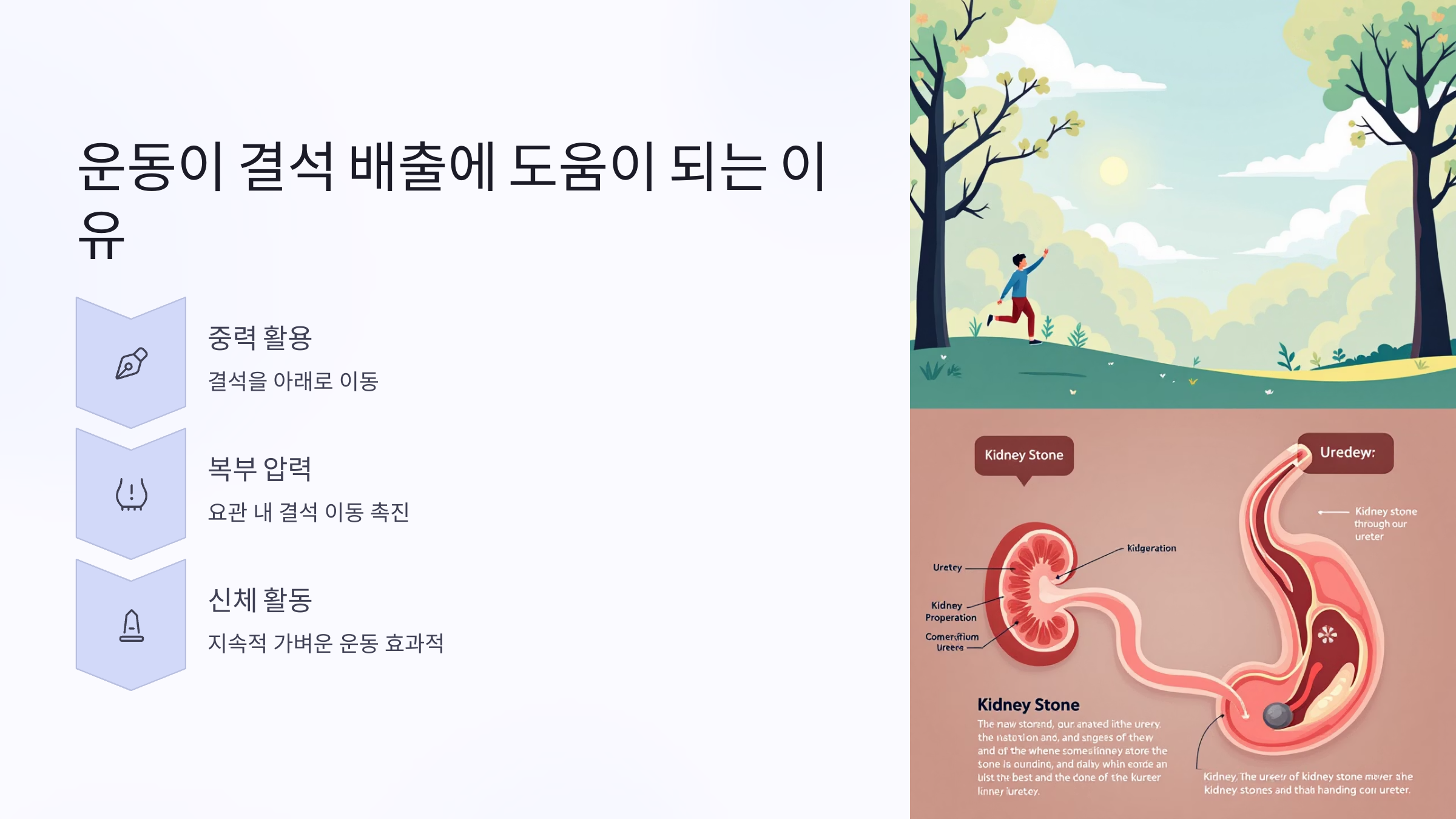 운동은 중력과 복부 압력을 활용해 결석을 아래로 이동시키는 데 도움을 줍니다. 🏃